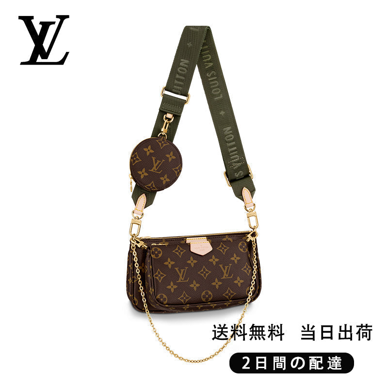 \n - 複数のポケットとコンパートメントを備え、クロスボディバッグとして多用途にお使いいただける「ミュルティ・ポシェット・アクセソワール」。「ポシェット・アクセソワール」、「ミニ・ポシェット・アクセソワール」、「ポルトモネ・ロン」を組み合わせたアイテムです。ポシェットには取外し可能なゴールドカラーのチェーンと「 」の文字を織り込んだジャカード生地の調節可能なストラップが付属し、さまざまな持ち方をお楽しみいただけます。