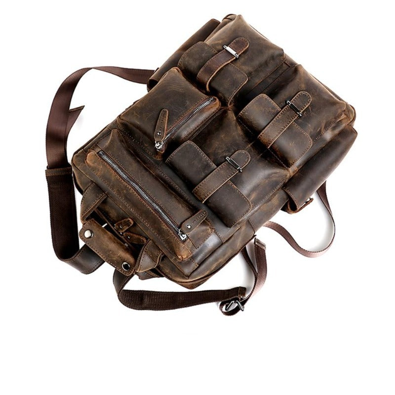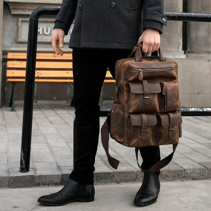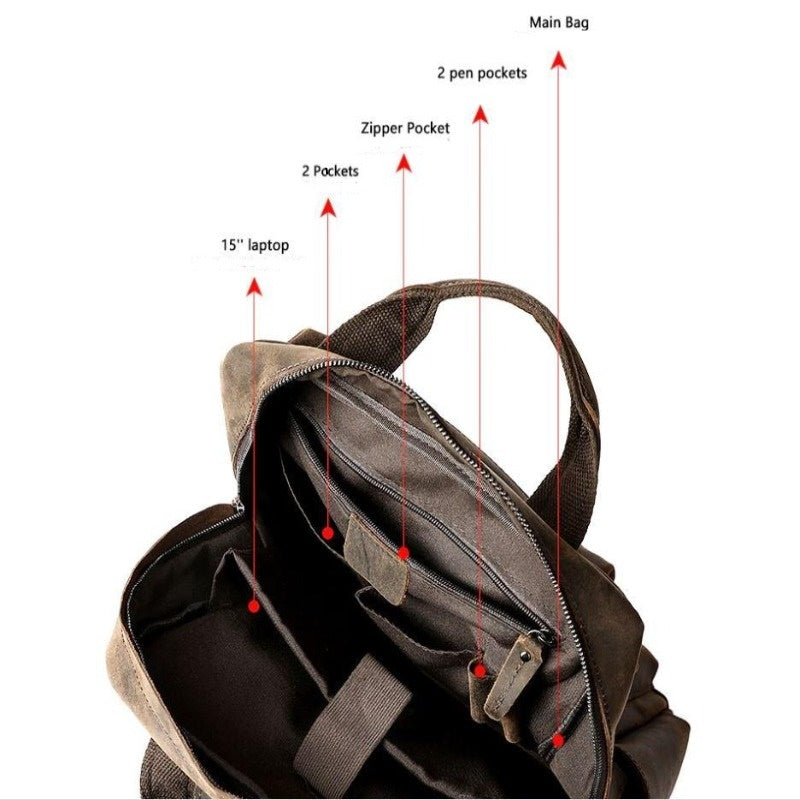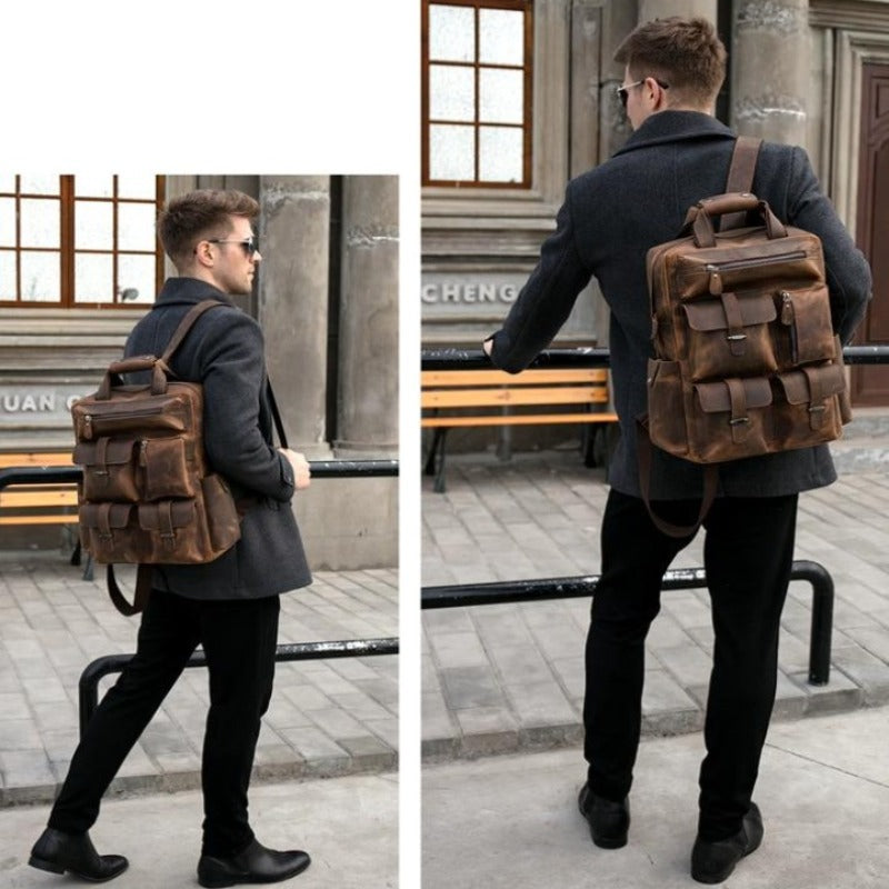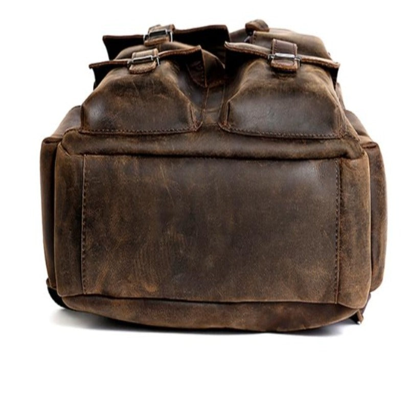 - This 100% genuine leather large backpack comes with huge storing capacity. The front of the bag has 5 pockets in total. 3 pockets with flap closure and 2 zipper pockets with leather pullers.