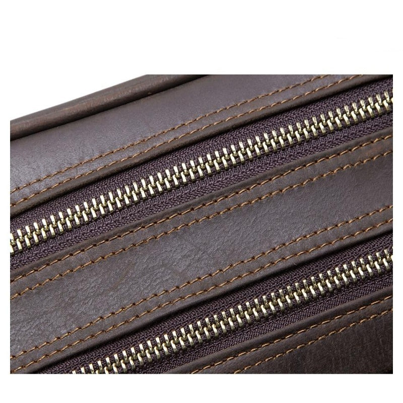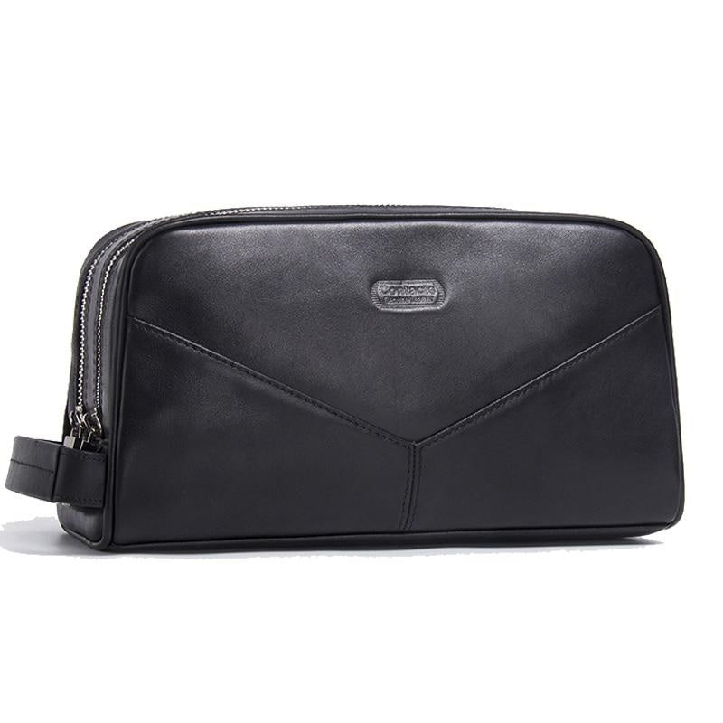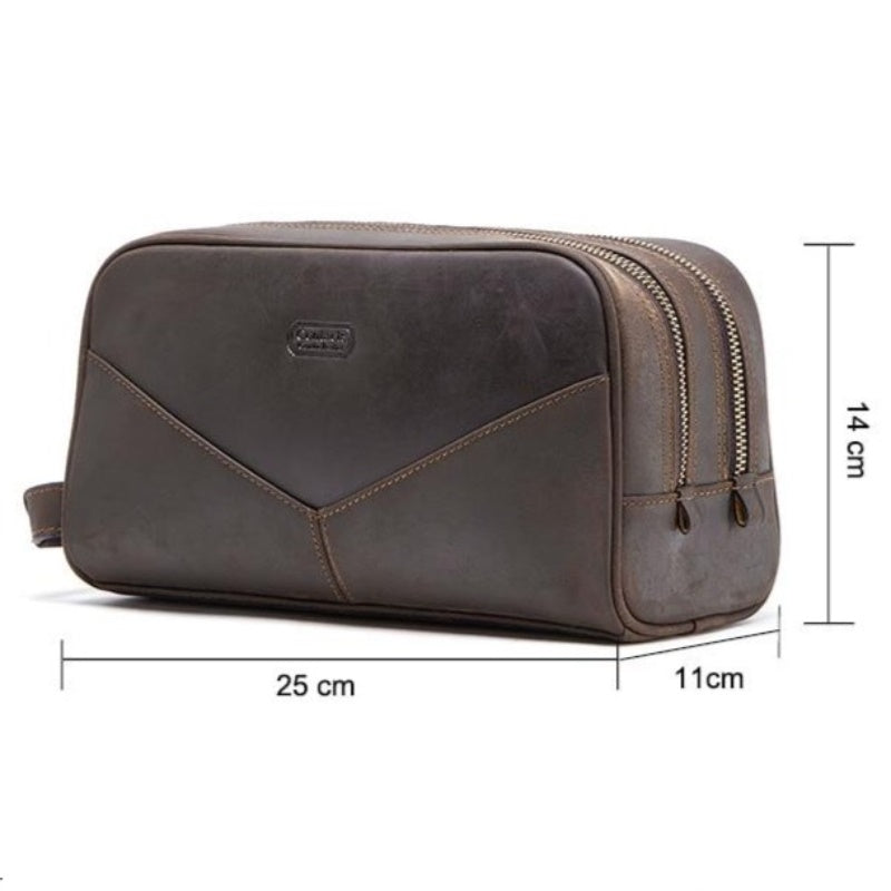 - This beautiful crazy horse leather toiletry bag comes with two metal zipper pockets on either side.